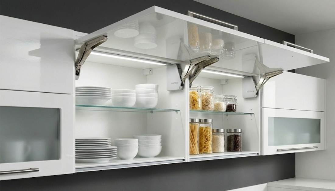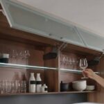 Marcos de Aluminio con Vidrio: El Brazo Free Flap Hafele se adapta perfectamente a perfiles de aluminio, dando un toque de lujo a los gabinetes superiores.
