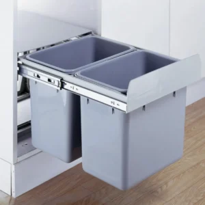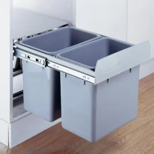 La Basurera Doble Extraíble 30 Litros es una solución funcional y moderna para la gestión de residuos dentro de muebles de cocina fabricados en melamina o madera.