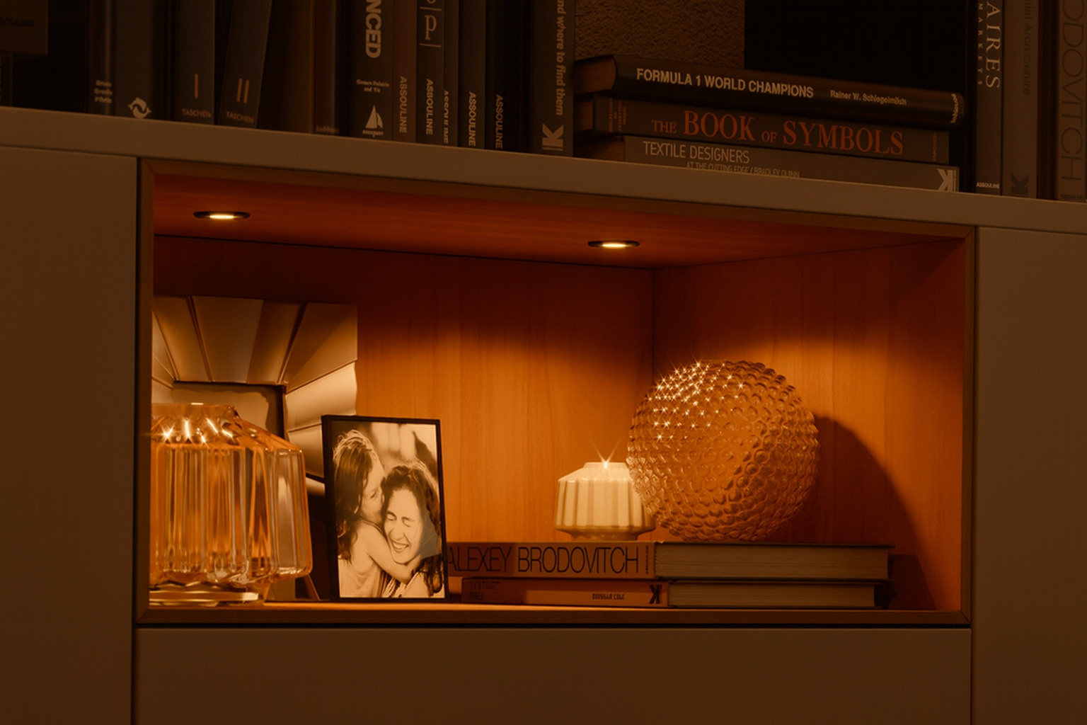 Luz LED empotrable tipo ojo de buey Hafele integrada en estantería, iluminación decorativa blanco cálido Spot LED empotrable Hafele instalado en vitrina de exhibición, iluminación blanco cálido para mobiliario comercial. OJO DE BUEY